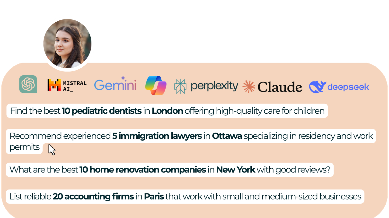 We optimize your brand to appear in AI-powered search results like ChatGPT, Gemini, Perplexity and Copilot, increasing visibility where users search today.